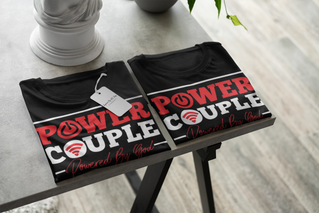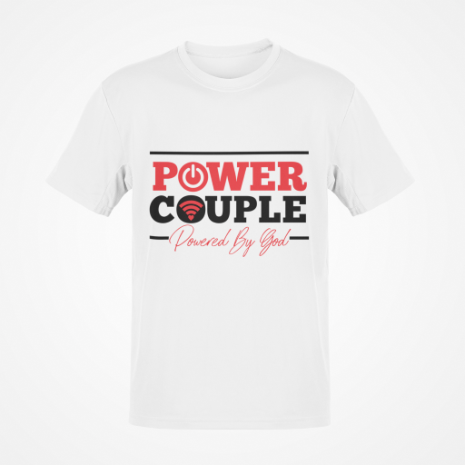 - Design reads, "Power Couple Powered By God."