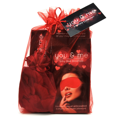 Featuring the You & Me game, a You & Me Silky Red Blindfold and the You & Me On A Bed Of Roses petals.